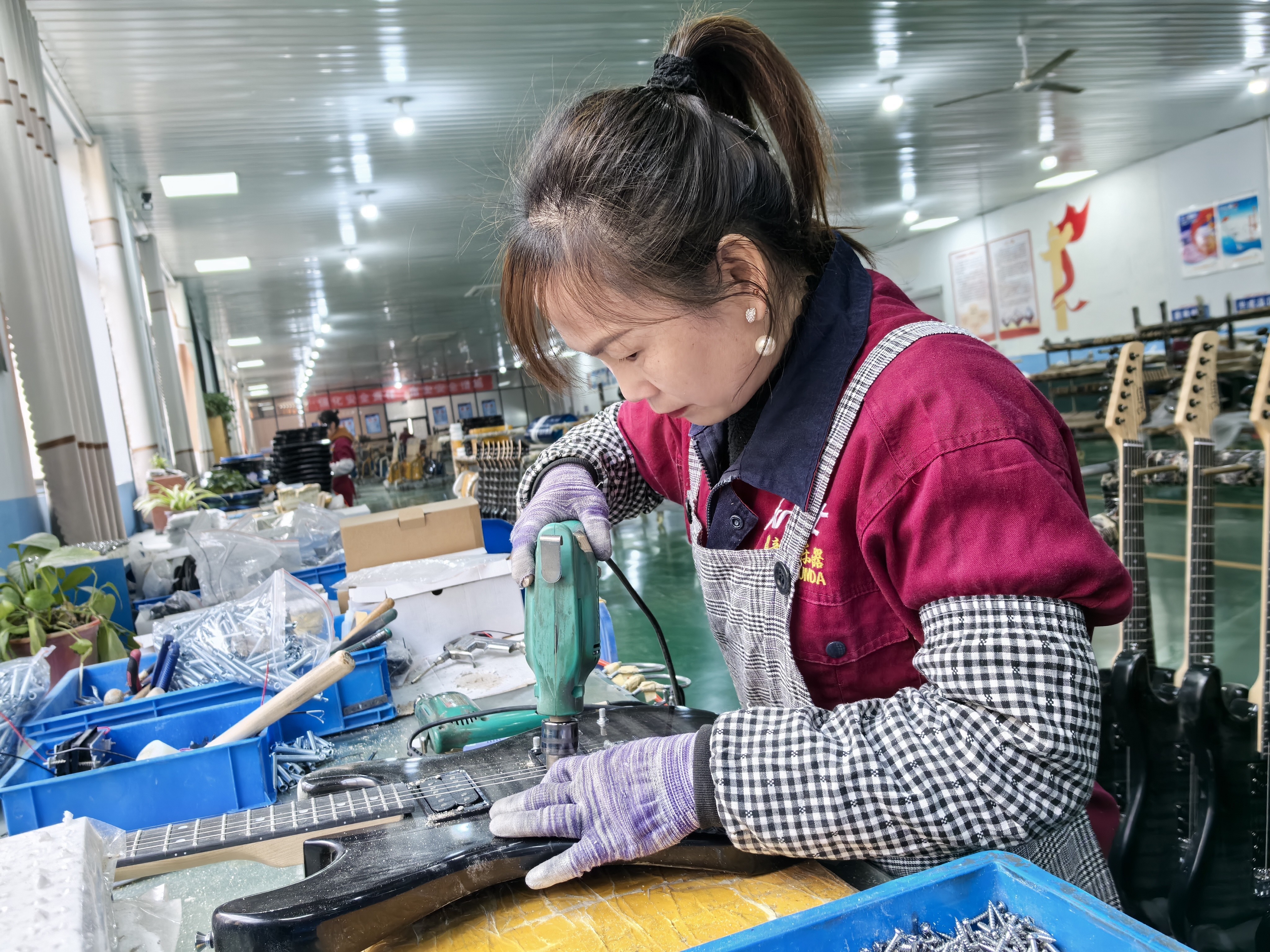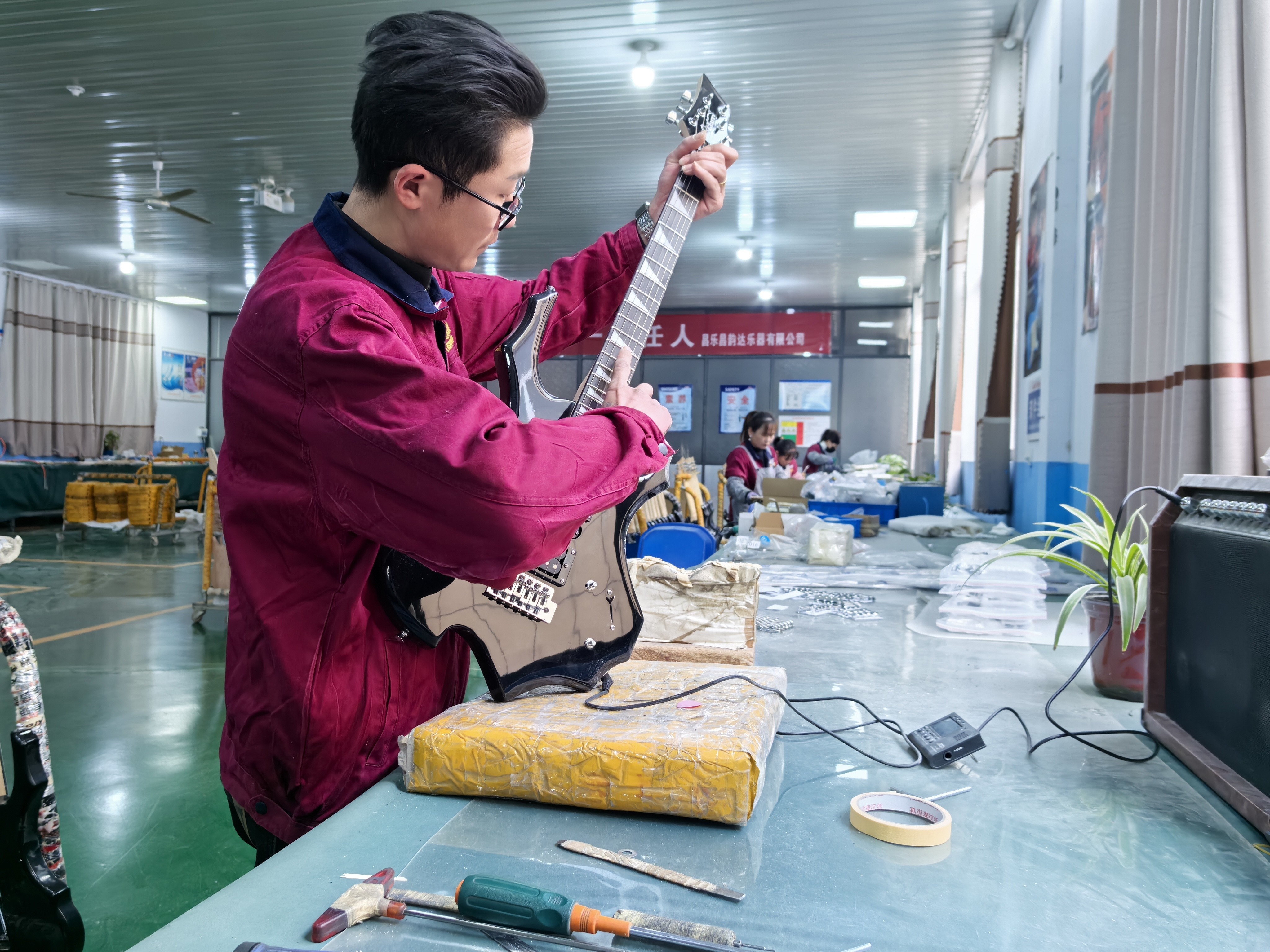 调整吉他下方拉弦板位置,再对着音响精细调整拾音器高度,接着依次调整琴头、弦枕……在山东省潍坊市昌乐县鄌郚镇,一间电吉他生产车间里,农民李庆生动作娴熟,行云流水。