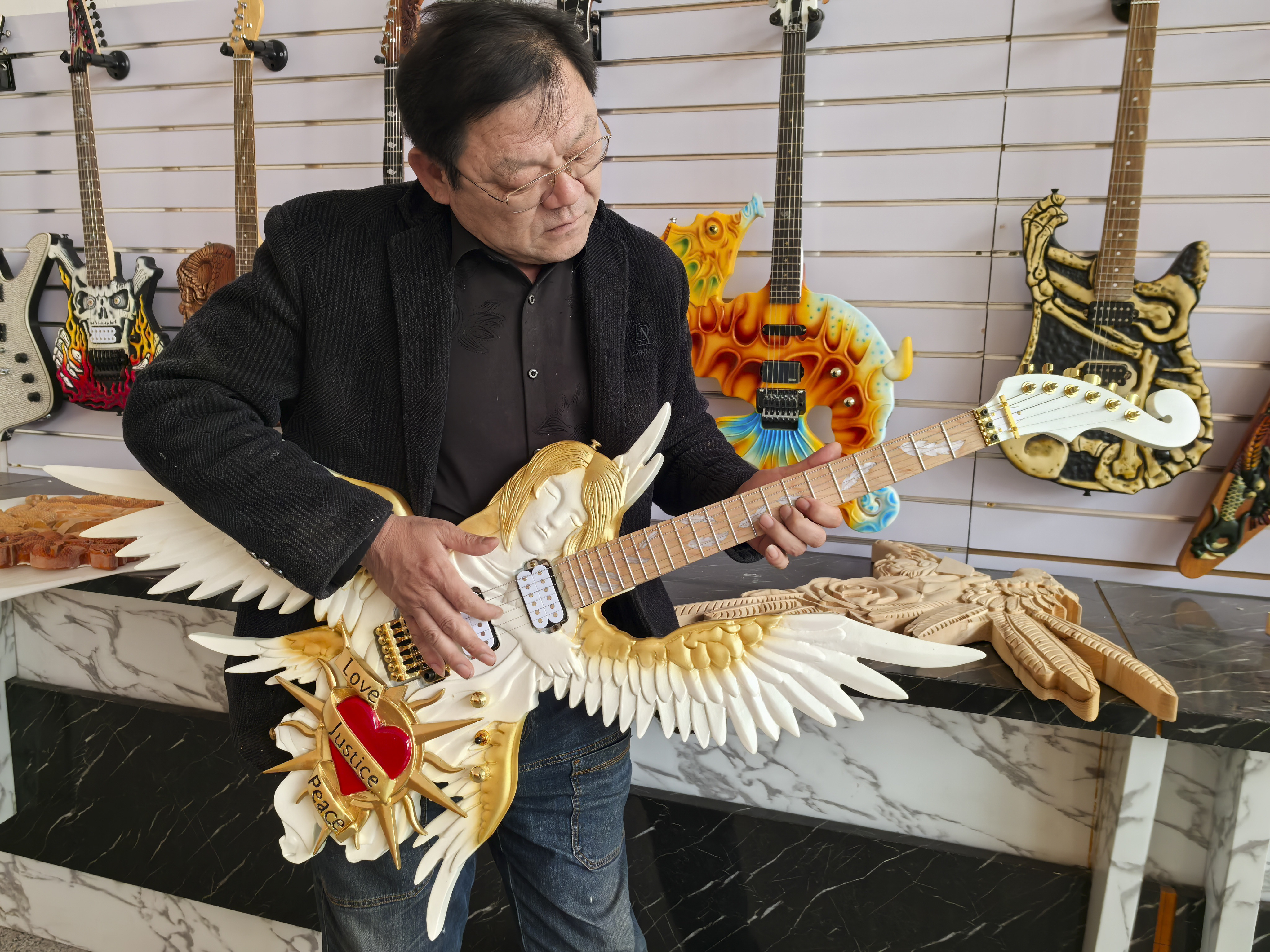 手工制琴匠人张清军在给作品调音(2月18日摄)。新华社记者 袁敏 摄记者在张清军的工作室看到,一把天使造型的吉他惟妙惟肖,十分精美。“这把吉他从设计到制作大概一个月,售价近6000元。”令张清军高兴的是,这几年国外客户对中国风元素更感兴趣,他设计的中国龙系列吉他成为订单量最大的产品之一。